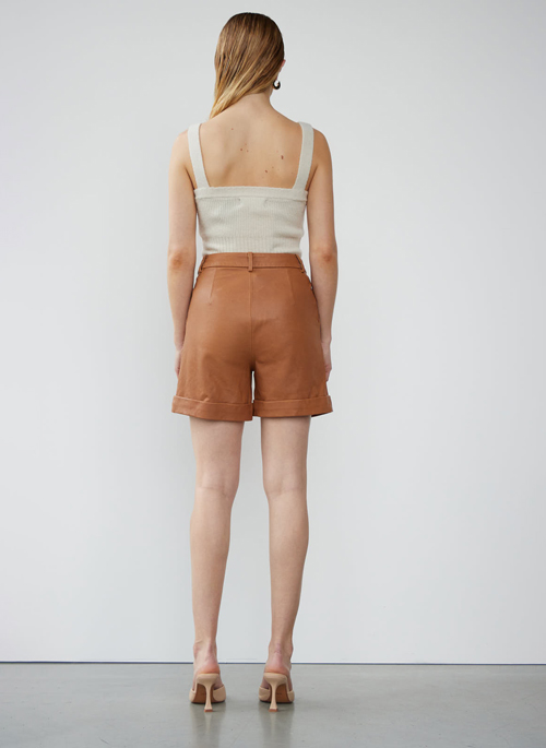 Beautiful high-waisted real leather bermuda shorts. Featuring front pockets, fold up detail in the leg opening and zip fly. The style is made with belt loops, so you easily upgrade it with a belt. These shorts is made of 100% leather – Invest in style. All of our real skins are vegetable processed without the use of chemicals. It is more expensive than conventional chrome leather, and the leather achieves many special properties. It’s a good choice for the discerning leather buyer – more sustainable, of higher quality and gets better over the years. The height of the model is 176 cm and she is wearing a size S.