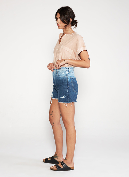 A modern high waisted short with a button fly, finished with thoughtful destruction and a dimensional eco wash technique.