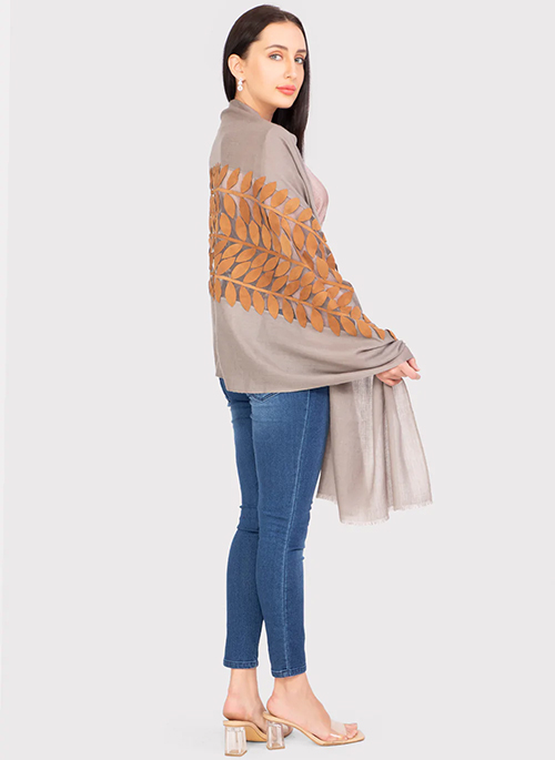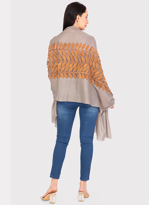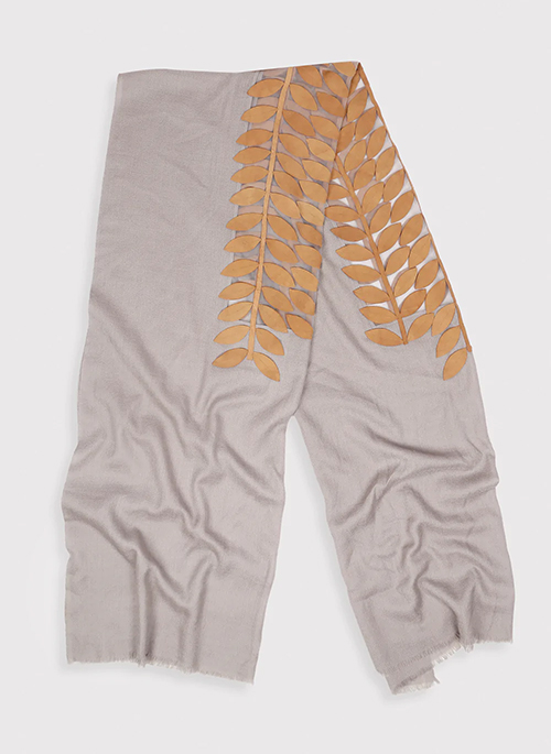 Woven from an incredibly soft cashmere, this mousse scarf features a contrasting brown suede leather leaf applique patch cut into the center of the scarf. With wispy eyelash fringes at the ends this signature scarf can accessorize any outfit year-round and will keep you stylishly warm whilst turning heads.