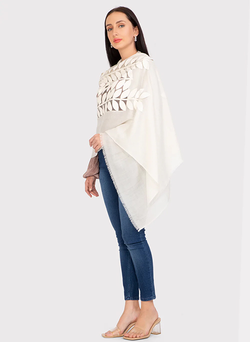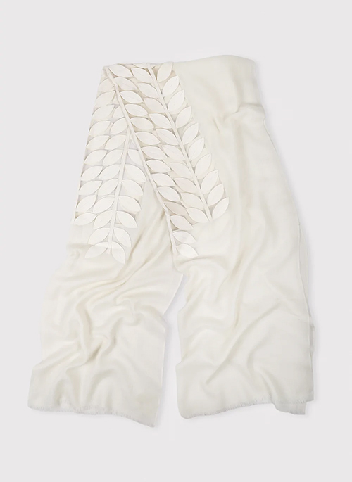 Woven from an incredibly soft cashmere, this ivory scarf features a tonaal ivory suede leather leaf applique patch cut into the center of the scarf. With wispy eyelash fringes at the ends this signature scarf can accessorize any outfit year-round and will keep you stylishly warm whilst turning heads.