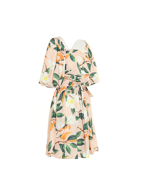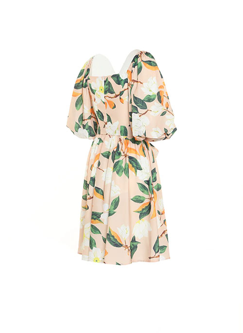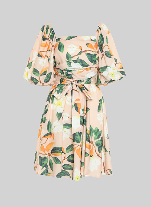 Details: Floral Printed Square neck Waist tie Puff sleeve Back zipper 65% COTTON 35% POLYESTER