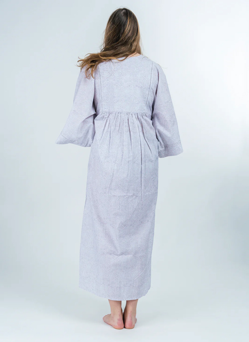Soft cotton block printed with our petite floral design in a lovely shade of turquoise or lavender. The dress is generous and fits many shapes. It has a V neck yoke top trimmed with hand embroidered detail, drop shoulder with butterfly sleeves. We’ve also added pockets. Perfect for lounging around the house, walking around town, and fits comfortably in one’s suitcase as you venture off to some sunny location.