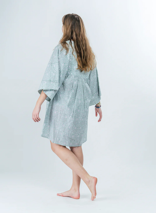 Soft slightly sheer cotton block printed with our petite floral design in a soft green. The dress is generous and fits many shapes. It has a V neck yoke top trimmed with hand embroidered detail, drop shoulder with butterfly sleeves. We’ve also added pockets. Perfect for lounging around the house, walking around town, and fits comfortably in one’s suitcase as you venture off to some sunny location.