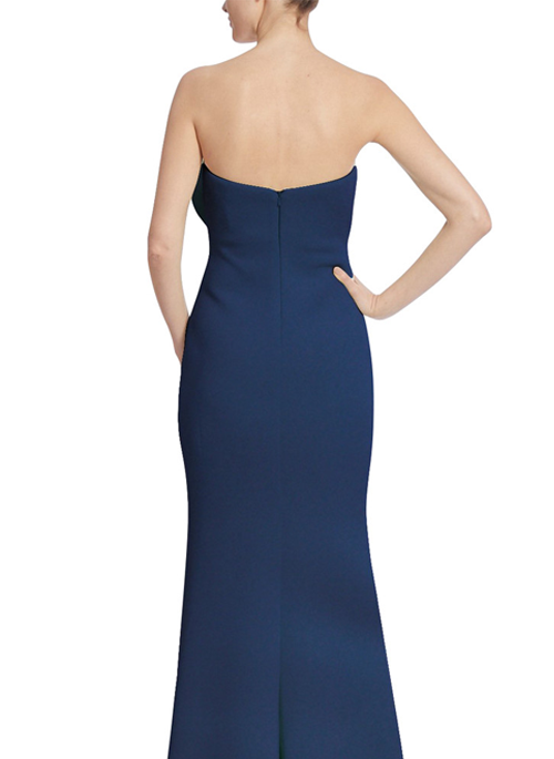 - Made from the finest stretch scuba fabric, this strapless evening gown is designed to accentuate your curves, featuring a flattering mermaid silhouette that cascades gracefully to the floor. Adorned with a stunning flower embellishment on the chest, it's a true masterpiece that infuses your look with romance and whimsy.