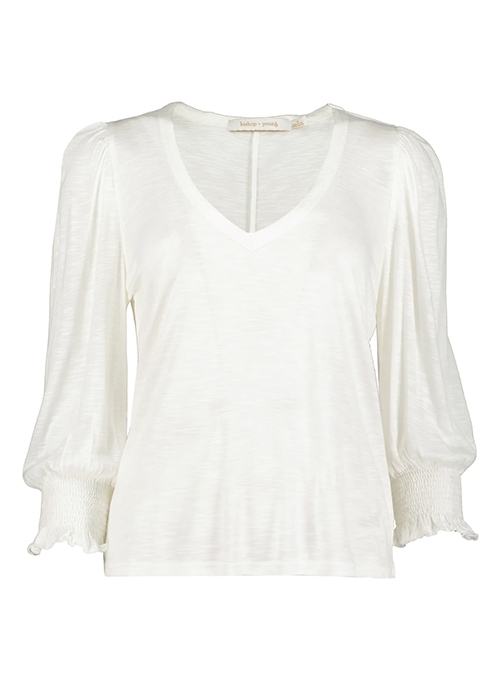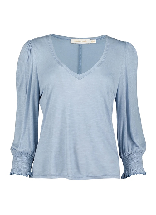 Flowerchild Tee Details: 100% Rayon V-neckline Peasant sleeves with smocked hem FIT-Relaxed fit