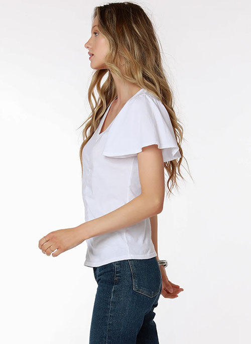 A perfectly chic top full of details. Featuring flutter sleeves for that extra flounce, center front seam shirring, and a deep V neckline. Pairs perfect with your best jeans.