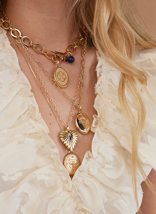 - Locket pendant made of sterling silver dipped in 14k gold, measuring 1" across and approximately 1.6" in height.