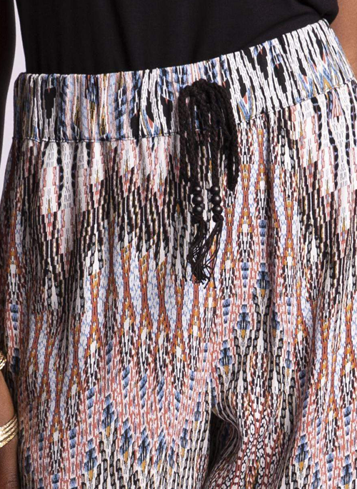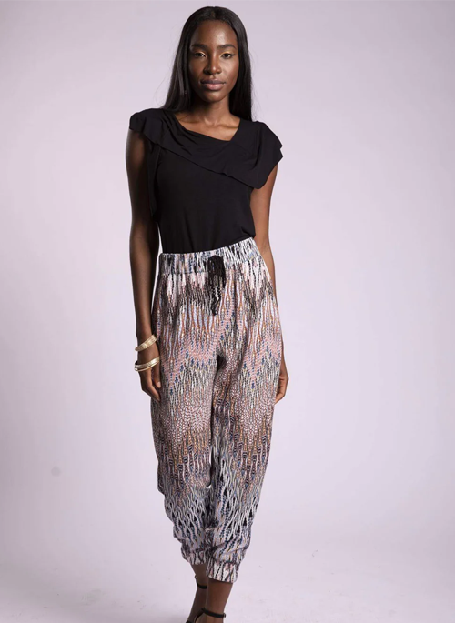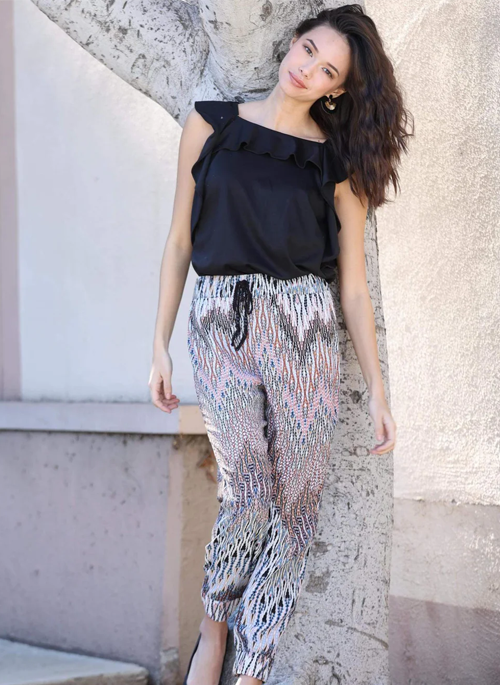 An elevated fashion jogger that you can wear around the house, to work, brunch, or out on the town? Sign us up! This soft and lightweight patterned crepe feels silky and sleek. The multi-colored flame-stitch pattern is an eye catcher.