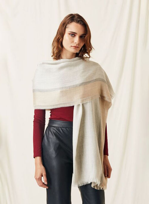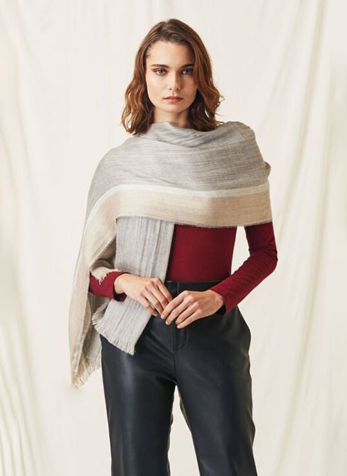 Sober baby alpaca shawl in neutral tones. Made of baby alpaca and silk, it complements any outfit. Baby Alpaca is an especially soft grade of Alpaca. Alpaca fiber stands out for being as soft as Cashmere, but warmer, lighter and more durable. Alpaca is also water repellent and keeps you warm even when wet. Pair with one of our 100% Baby Alpaca Sweaters and you are sure to stay warm, comfortable & stylish in any setting.