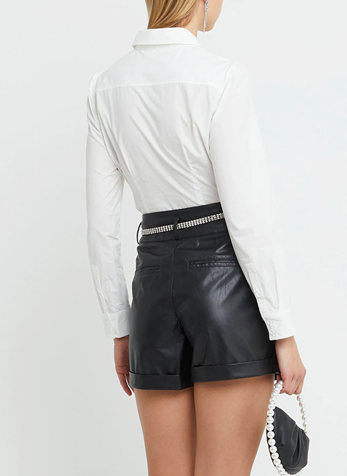 Take the dress shirt trend to new heights with this ultra cool, cut-out rendition of the classic top. Done with a bustier-like bodice in 100% cotton.