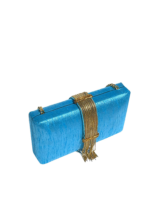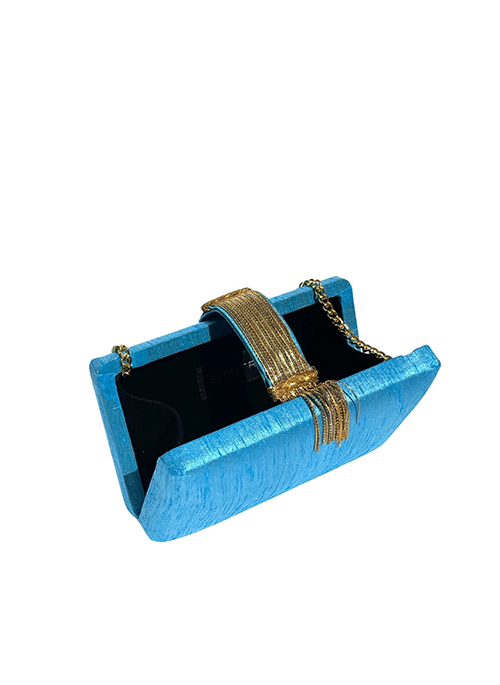 - Blue colored cruelty free silk clutch with hanging gold tassels on the front and back flap
