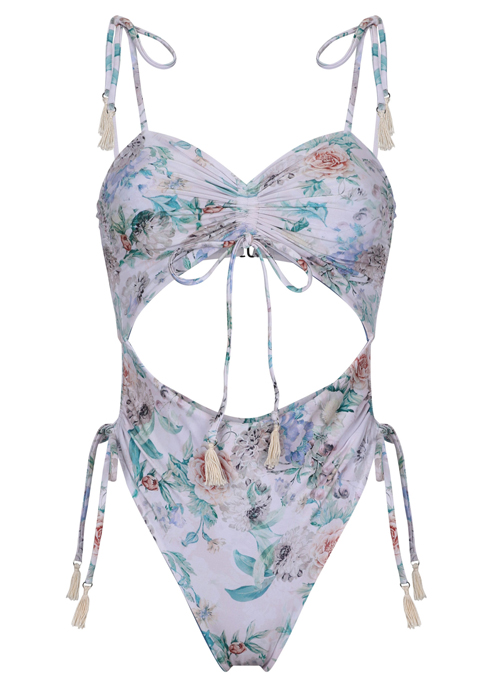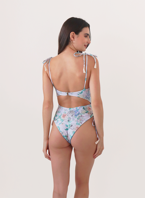 Your new go-to one-piece, guaranteed. Featuring front and back cut outs with a high leg and cheeky coverage. With a center cinched detail, this piece gives your girls the push up they deserve.