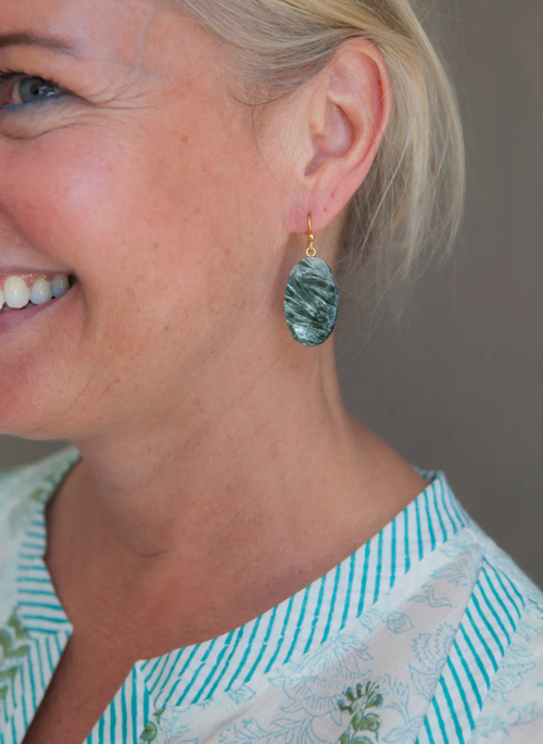 Botswana Agate semi-precious stones cut in thin slices with a 14c gold hook. These super lively lightweight earrings have a natural class that we are loving. Each piece is unique.