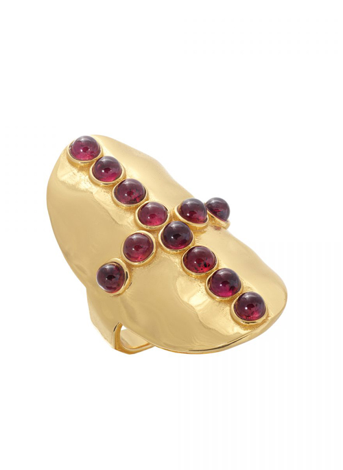 We dare you to resist the burnished sheen of this hammered, highly-polished gold plated oval ring. It features a mesmerizing cross, formed by perfectly rounded pearly stones, themselves carefully encased in the warm gold-plated metal. A modern classic, transcending time. Comes in amethyst, garnet and black onyx.