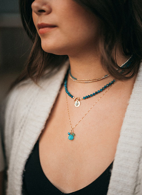 Part of our "Chroma" Collection, We love these new "Charm" Necklaces- instead of using the typical metal charms, we mixed metal with beautiful stones "charms" to create movement and color. This combination has a Blue Chalcedony faceted pear (approx. 9mm x 10mm), two Green Aventurine faceted Rondelles (approx. 4.25mm), and an Apatite faceted Rondelle (approx. 4.5mm) and is reminiscent of the ocean.... All stones are hand wire-wrapped and sit on a 20" sparkly box chain.