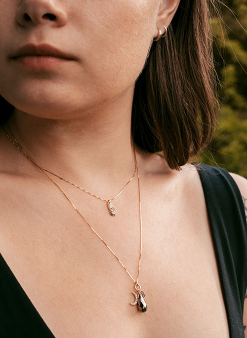 Part of our "Chroma" Collection, We love these new "Charm" Necklaces- instead of using the typical metal charms, we mixed metal with beautiful stone "charms" to create movement and color. This combination has a Pyrite faceted Teardrop (approx. 15mm x 6.5mm), and two Smoky Topaz faceted Rondelles (approx. 3mm). All stones are hand wire-wrapped and hang with a pave diamond moon charm, sitting on a 20" sparkly box chain.