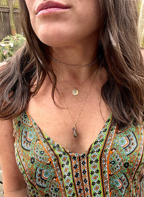 Part of our "Chroma" Collection, we love these new "Charm" Necklaces- instead of using the typical metal charms, we use beautiful stone "charms" to create movement and color. This combination has a Pyrite faceted Teardrop (approx. 15mm x 6.5mm), and two Smoky Topaz faceted Rondelles (approx. 3mm). All stones are hand wire-wrapped and sit on a 20" sparkly box chain.