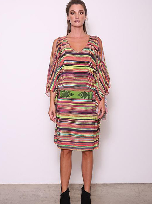 - V-neck drape tunic dress with slit sleeves and contrast belt