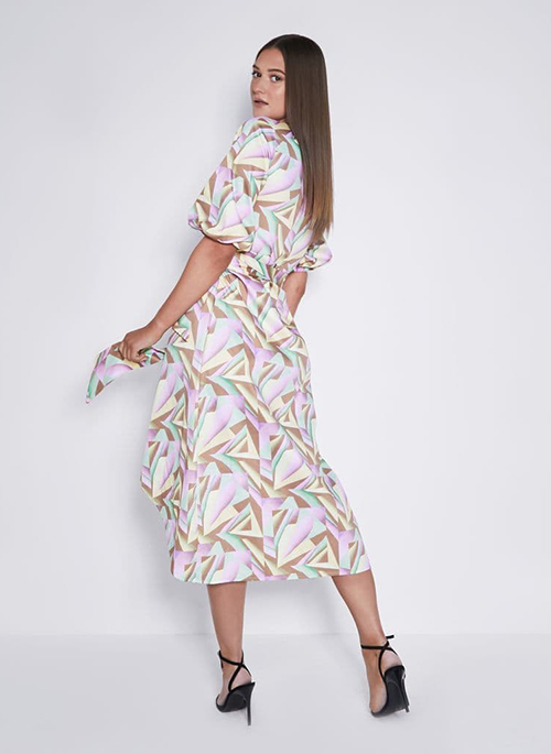 The Georgie dress is a wrap dress to flatter featuring a self-tie belt to fasten, ¾ length sleeves, a fitted wrap around bodice, and a shaped front skirt with a dip back hem.