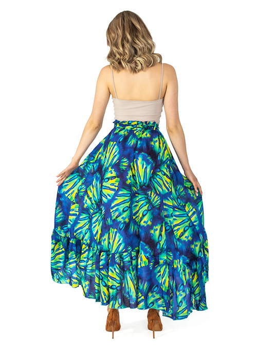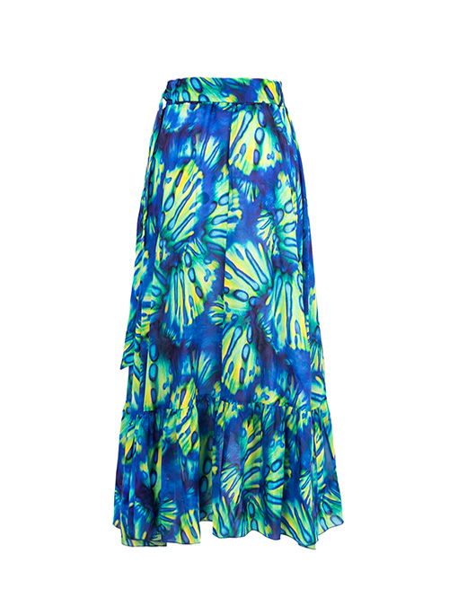 Summer asymmetrical skirt, slightly shorter at the front. Finished with frills with a belt that can be tied at the back or at the waist.