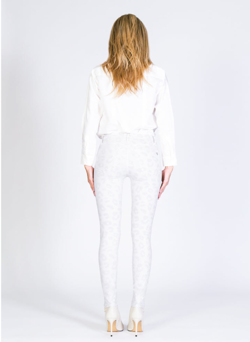 Our Gisele features a 10-inch rise giving you extra long-looking legs that will not fail to please. Snow Leopard is a white denim with a subtle leopard print.