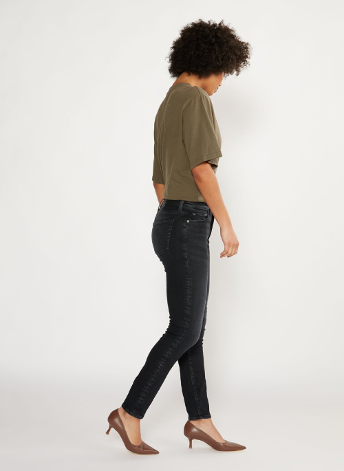 A timeless mid-rise skinny in a sleek washed black. Fit is slim, sitting comfortably on the hips and elongating the legs.