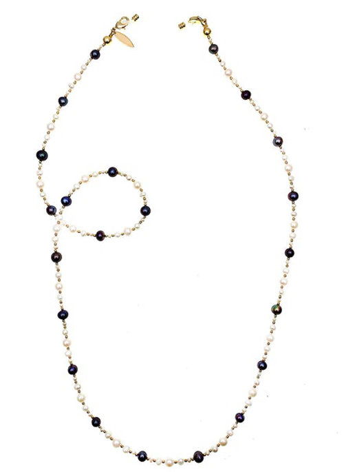 This handmade glasses chain is made of freshwater pearls, black pearls, and Japanese gold plated brass findings. The chain is designed to be attached to a pair of glasses which it's beautiful and convenient. This design can be worn as a glasses chain or a single long or double wrapped necklace for any occasion as well.