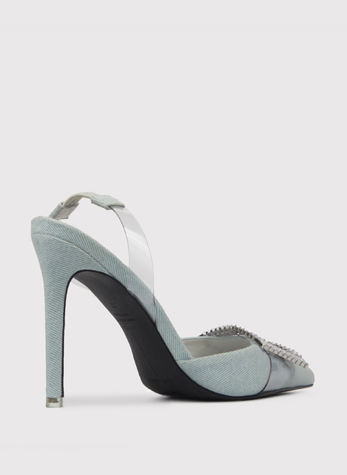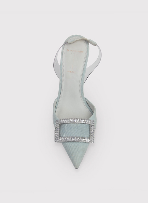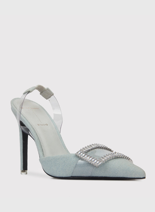 Our GLENDA slingback pumps are sure to turn heads. They have elongated pointed toes, and an elegant profile and best of all, the vamp is embellished with a crystal buckle for inimitable glamour.