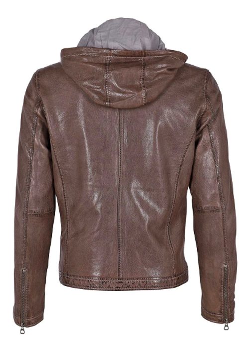 Hooded leather jacket with one pocket on the left side, this simple yet stylish leather look is one you'll love!