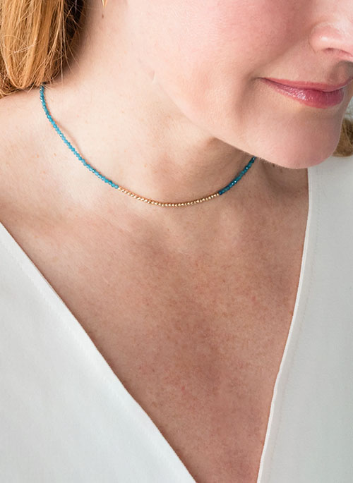 A delicate yet standout piece, this choker with 2 inches of 14K gold beads in the middle surrounded by faceted Apatite beads is sophisticated and sweet! It can be worn alone or layered with another necklace to create a bolder look!