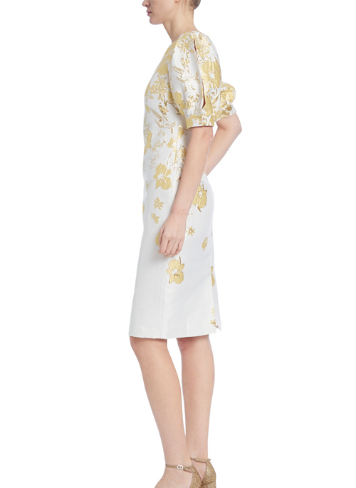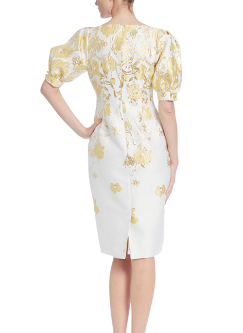 Adorned with a lavish golden Jacquard floral design, this sheath gown is the perfect choice for a special evening where you want to exude opulence and refinement. The rich, golden hues and intricate floral details are masterfully woven into the fabric, creating a truly mesmerizing visual feast that is sure to capture every eye in the room.