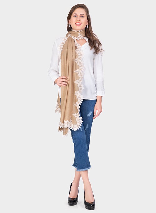 Woven from a fine silk and wool blend, this natural scarf features a contrasting beige bold scalloped edging lace border. This chic and contemporary accessory keeps you stylishly warm.