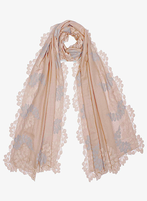 Woven from a fine silk and wool blend, this scarf features a bold scalloped edging in a double colour lace border, a combination of one contrasting and one tonal colour. A very fashionable accessory for day or evening wear all year-round.