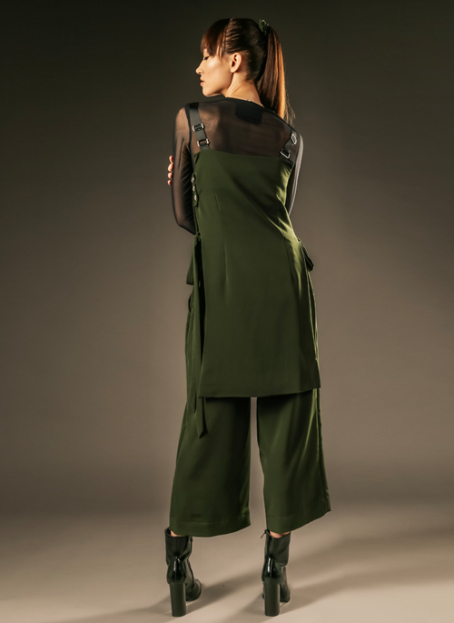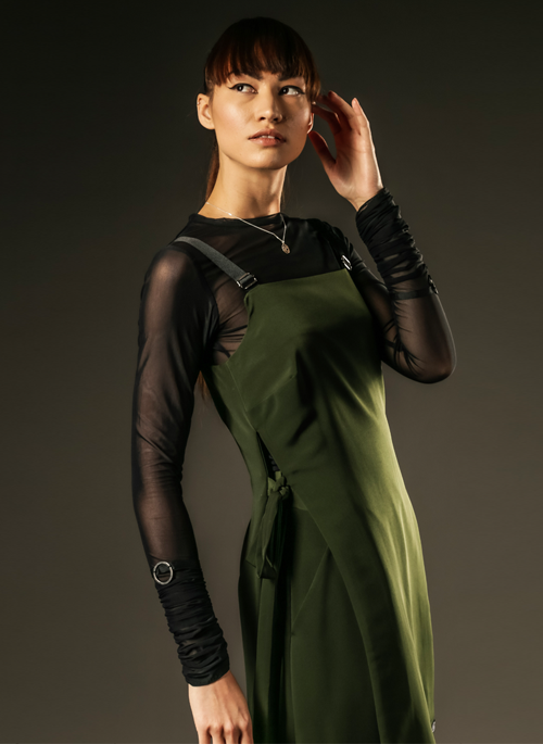 Through Made-To-Order, we can limit excess stock, reduce our environmental impact and slow fashion down. Each piece is limited edition to ensure you stand out from the crowd, so don't miss out! Our avant-garde Green Pinafore Dress is designed to be a statement piece to complete a layered outfit. Hand-crafted in a luxury crepe that drapes effortlessly with open sides, finishes just above the knee.