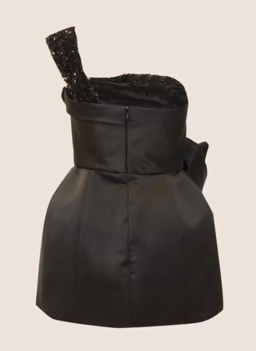 Short black one-shoulder dress with a trunk shape in duchesse and tone-on-tone micro sequin details. The minidress is enriched by the sartorial application on the side of a rose and by the drapery on the bodice. The zip closure is central on the back.