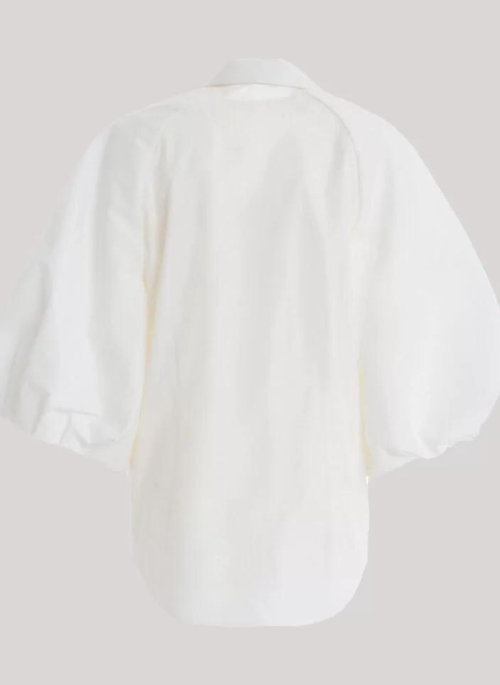 White fine cotton shirt with wide puff sleeves. The central buttoning on the front is hidden, enriched by the detail of the only visible button on the neck in green swarovski. Head designed and made entirely in Italy.