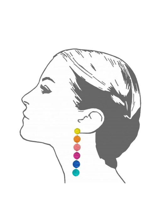 - Long drop earrings made of round silk cord-covered balls connected with silver chain.