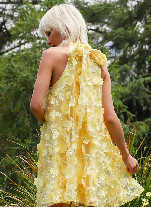 Swing into the new season in our gorgeous petal swing dress. This fun and flirty mini silhouette is fashioned from a lightweight mesh fabric embellished with 3D petals. This halter neck dress is fully lined, ties at the back and is perfect for any occasion.Details:
