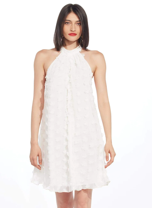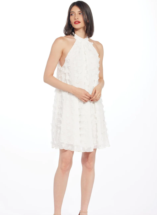 Swing into the new season in our gorgeous petal swing dress. This fun and flirty mini silhouette is fashioned from a lightweight crinkled chiffon fabric embellished with 3D petals. This halter neck dress is fully lined, ties at the back and is perfect for any occasion.