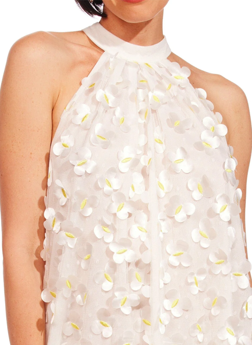 Swing into the new season in our gorgeous daffodil petal swing dress. This fun and flirty mini silhouette is fashioned from a lightweight mesh fabric embellished with 3D Daffodil white petals and a tiny yellow center. This halter neck dress is fully lined, ties at the back in a long sash, and is perfect for any occasion!