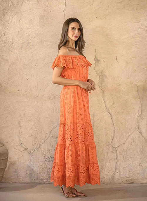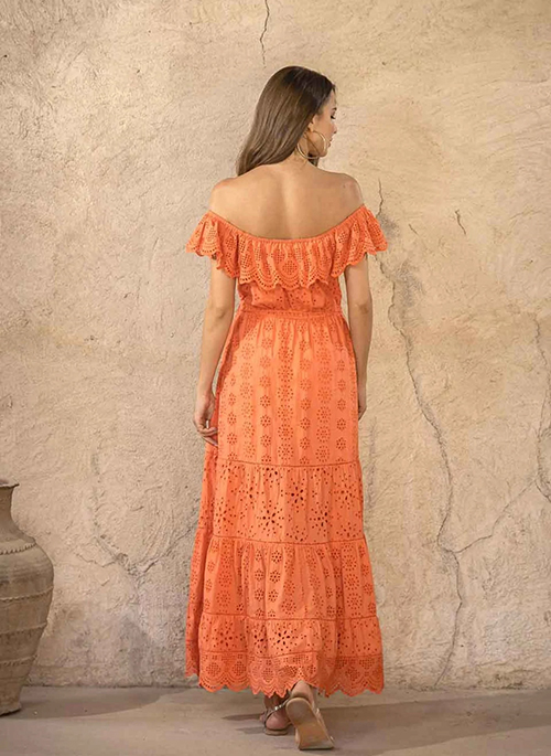 A sensual broderie anglaise tiered maxi dress for any summer occasion. Made of 100% cotton and a mix of different embroidery patterns, this dress has a snug fit over the chest area and enough volume to be comfortable on a hot summer day. Elasticated shoulder ruffle allows you to wear it showing off shoulders completely or for a more modest look, ruffles will cover your shoulders. Comes with a detachable sash belt string, decorated with a tiny tube stopper.