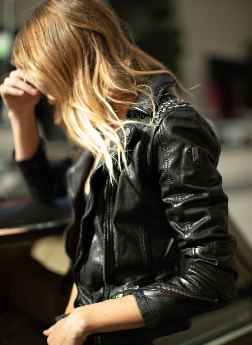 Who says your wardrobe can't make you happy?! Our classic moto jacket with stud detailing on the shoulders certainly makes us smile!