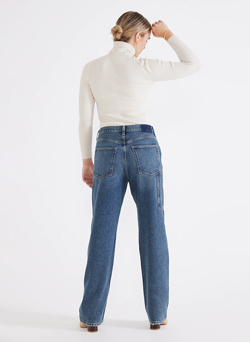 This utilitarian style jean combines carpenter paneling and triple needle stitching on a relaxed boyfriend silhouette that sits low on the waist.