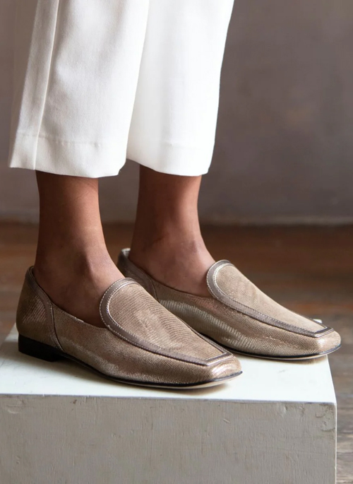 Cora is our new minimalist square toe loafer. Created an elegant contrast of leather textures outlined by a tonal trim.Details: