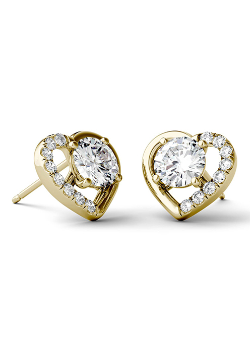 Hip, heart-shaped studs for your happening lifestyle! Crafted with 14K yellow gold, each elegant earring in this pair features a large heart-shaped cut-out with one round 5mm Forever Brilliant® moissanite stone in the center. Part of the heart is decorated beautifully with a lovely line of moissanites for added glam. Butterfly backings allow for simple fastening so you can carry on looking more fabulous than ever.