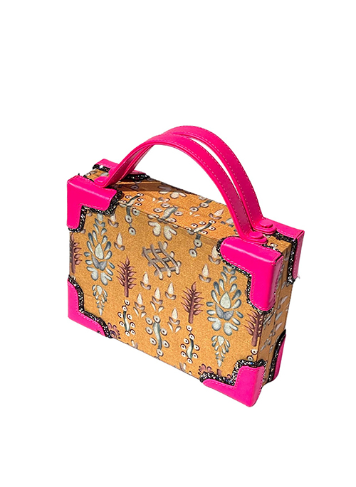 The earthy yellow with neon pink is bold and the art inspired motif framed by modern slate sparkly scalloped edges is unusual, reminding us that sometimes life can give us extraordinary surprises. We named her Henna for the henna motifs that adorn hands and feet during happy occasions. Show Henna off with a tee and jeans or bring her brunch with your favorite white summer dress.