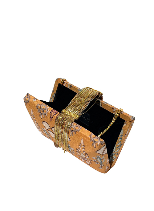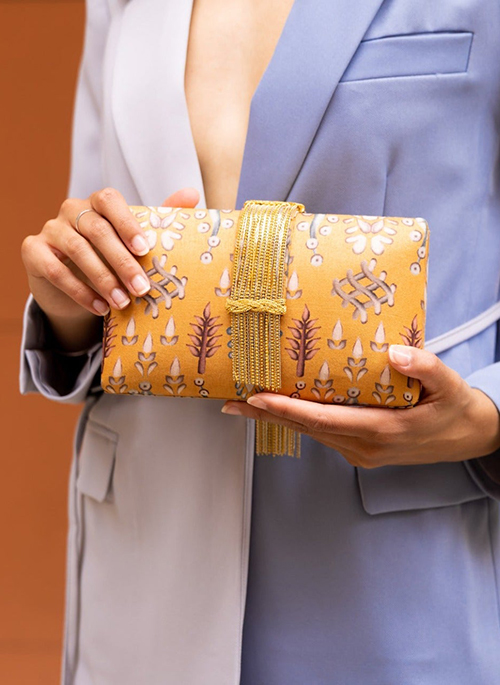 Artistic motifs cue to intricate henna design, this golden yellow graceful print is an elegant choice for a bridesmaid or a mother of a bride for a cheery summer or a dreamy fall wedding. After the wedding, take the handcrafted mixed metallic fringe clutch to a luxurious European vacation and everything in between.