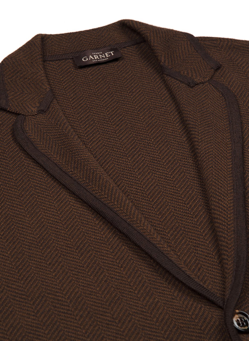 Long sleeve herringbone stitch blazer sweater in 100% Merino wool with three buttons, peak lapel, tipping detail, welt pockets, and no lining.
