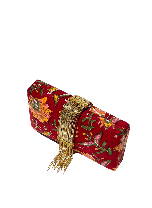 - Red & peach colored cruelty free silk clutch with hanging gold tassels on the front and back flap