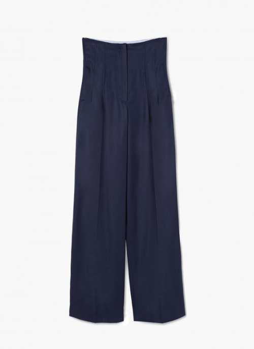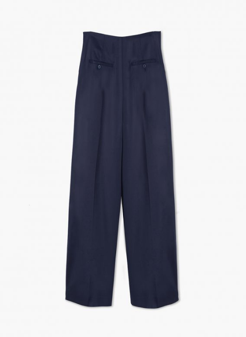 Fitted high-waisted trousers, straight-leg, and multiple waist-darts. Two-seam pockets and two patch pockets on the back.Details:
